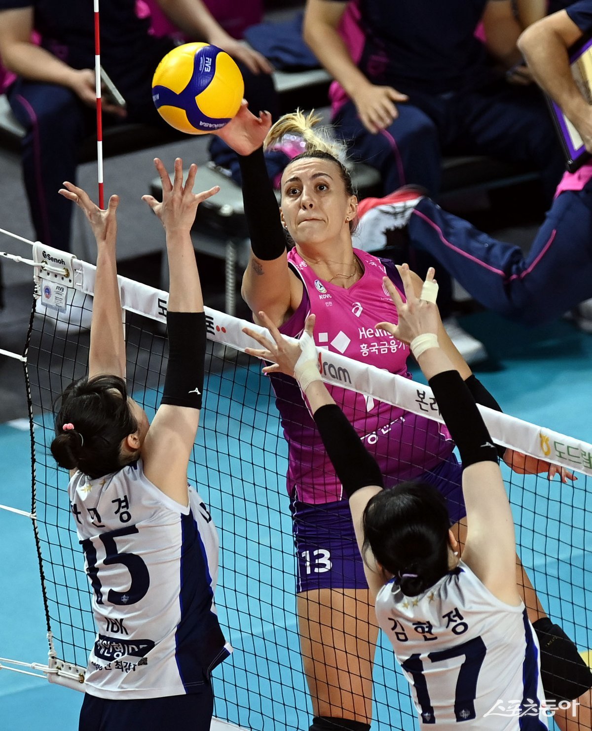 14일 인천 삼산월드체육관에서 ‘2023-2024 도드람 V리그’ 인천 흥국생명과 화성 IBK기업은행의 여자부 경기가 열렸다. 흥국생명 옐레나가 IBK기업은행 블로커를 피해 공격을 펼치고 있다.