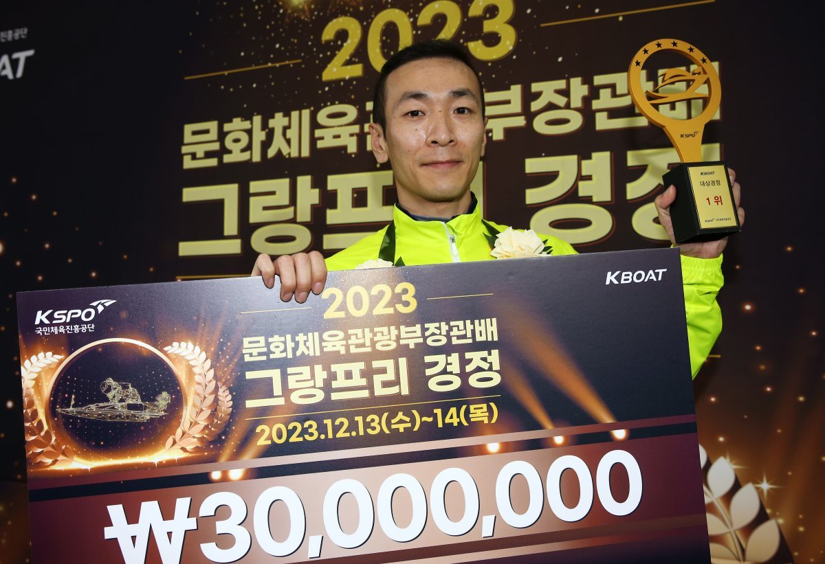 김민준이 ‘2023년 문화체육관광부장관배 그랑프리 경정’의 트로피를 들어올렸다.