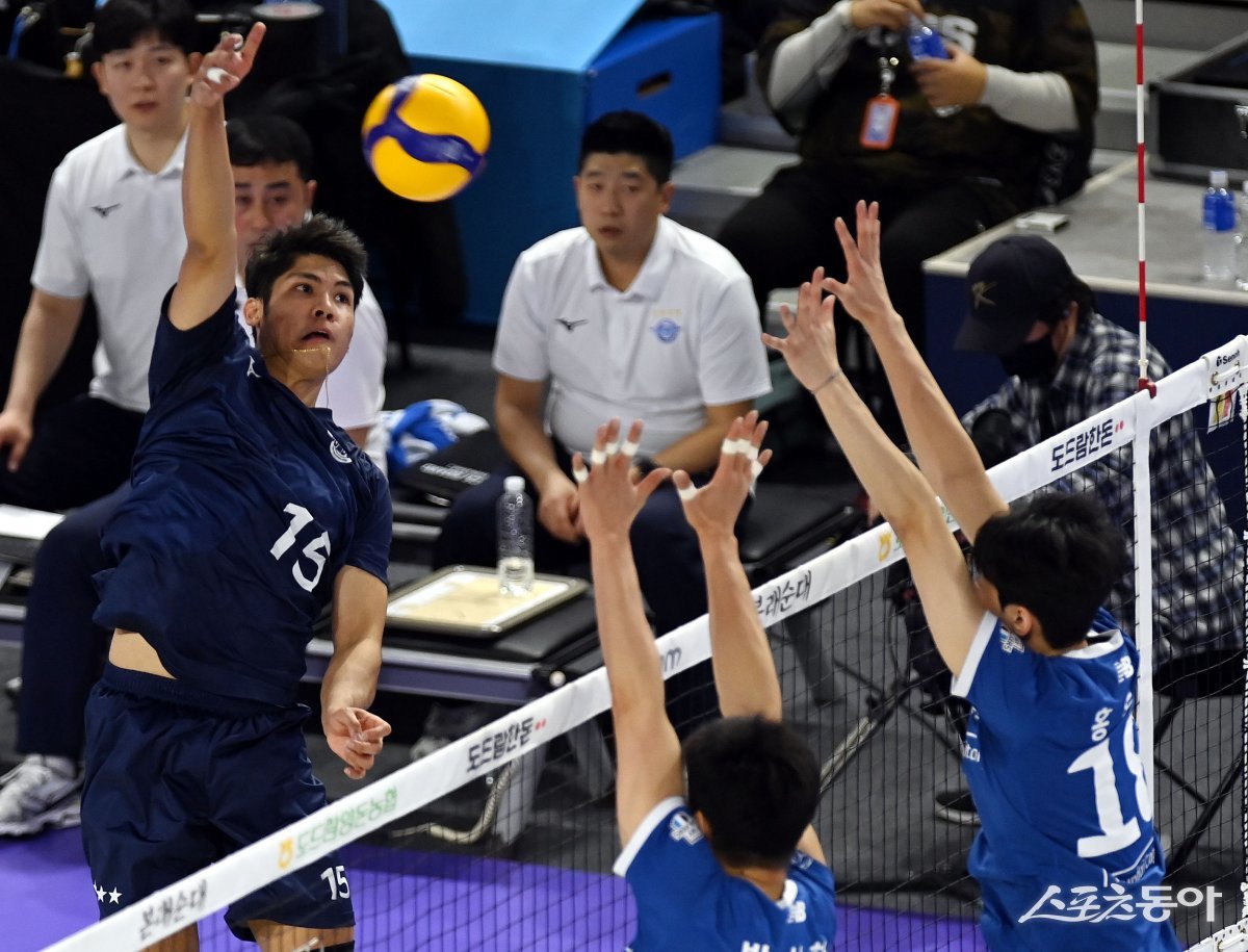17일 인천 계양체육관에서 ‘2023-2024 도드람 V리그’ 인천 대한항공과 천안 현대캐피탈의 남자부 경기가 열렸다. 대한항공 에스페호가 현대캐피탈 블로커를 피해 스파이크를 날리고 있다.
