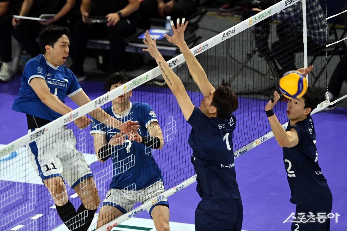 17일 인천 계양체육관에서 ‘2023-2024 도드람 V리그’ 인천 대한항공과 천안 현대캐피탈의 남자부 경기가 열렸다. 현대캐피탈 최민호가 대한항공 블로커를 피해 공격을 펼치고 있다.