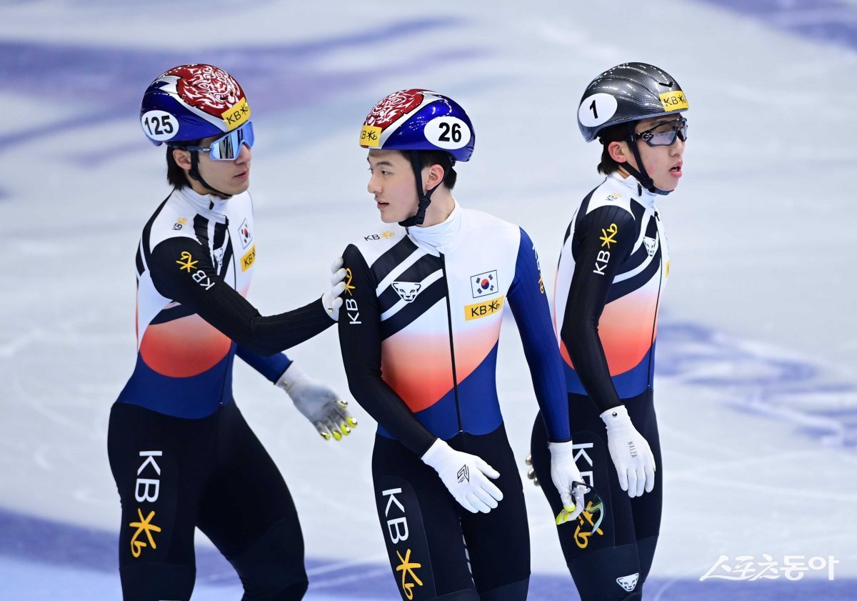 17일 서울 목동종합운동장 목동아이스링크에서 열린 ‘2023-2024 국제빙상연맹(ISU) 쇼트트랙 월드컵’ 4차 대회에서 남자 5000m 계주 결승전에 출전한 한국 황대헌, 장선우, 박지원이 서로를 위로하고 있다.