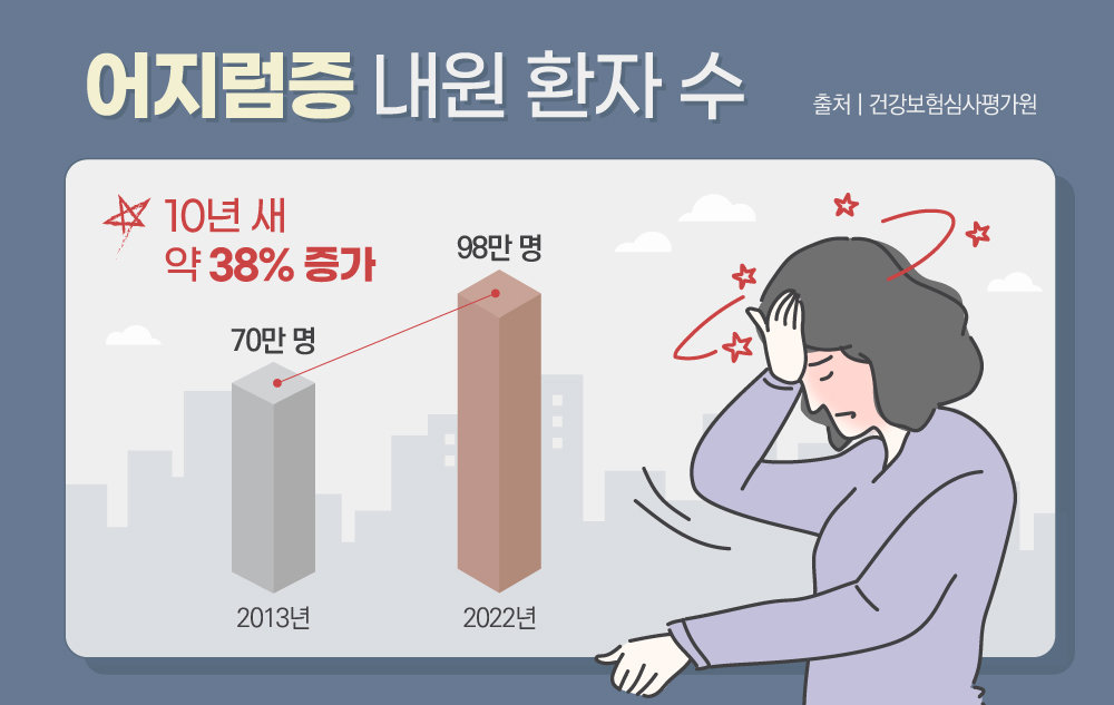 어지럼증은 일상생활에서 흔하게 나타나는 증상이다. 10명 가운데 3명이 살아가며 한 번 이상 경험하는 것으로 알려져 있다. 어지럼증은 자신과 주변 사물이 정지해 있음에도 움직이는 듯한 느낌을 받는 모든 증상을 통칭하는 용어로 가장 흔한 신경계 증상이다. 보통 시간이 지나면 호전되기 때문에 어지럼증을 빈혈과 저혈압 등 가벼운 질환으로 생각해 방치하는 사례가 많다. 최근 어지럼증으로 신체활동과 일상생활 어려움을 겪는 환자가 늘어나고 있다. 건강보험심사평가원 통계자료에 따르면 어지럼증 내원 환자수는 2013년 70만 명에서 2022년 98만 명으로 10년 새 약 38% 증가했다. H+양지병원 신경과 전문의 정재면 의무부원장은 “어지럼증은 현대사회에서 스트레스, 수면부족 등 원인으로 누구나 발생할 수 있다”며 “하지만 심한 어지럼증이 계속되면 퇴행성 뇌질환, 뇌졸중, 뇌종양 같은 중증 질환 전조증상일 수 있어 원인을 찾아 치료 받고 후유증을 최소화하는 것이 중요하다”고 말했다.