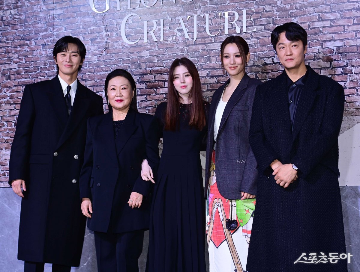 배우 박서준, 김혜숙, 한소희, 수현, 조한철이 19일 서울 용산구 레이어20스튜디오에서 열린 넷플릭스 시리즈 ‘경성크리처’ 제작발표회에서 포즈를 취하고 있다.