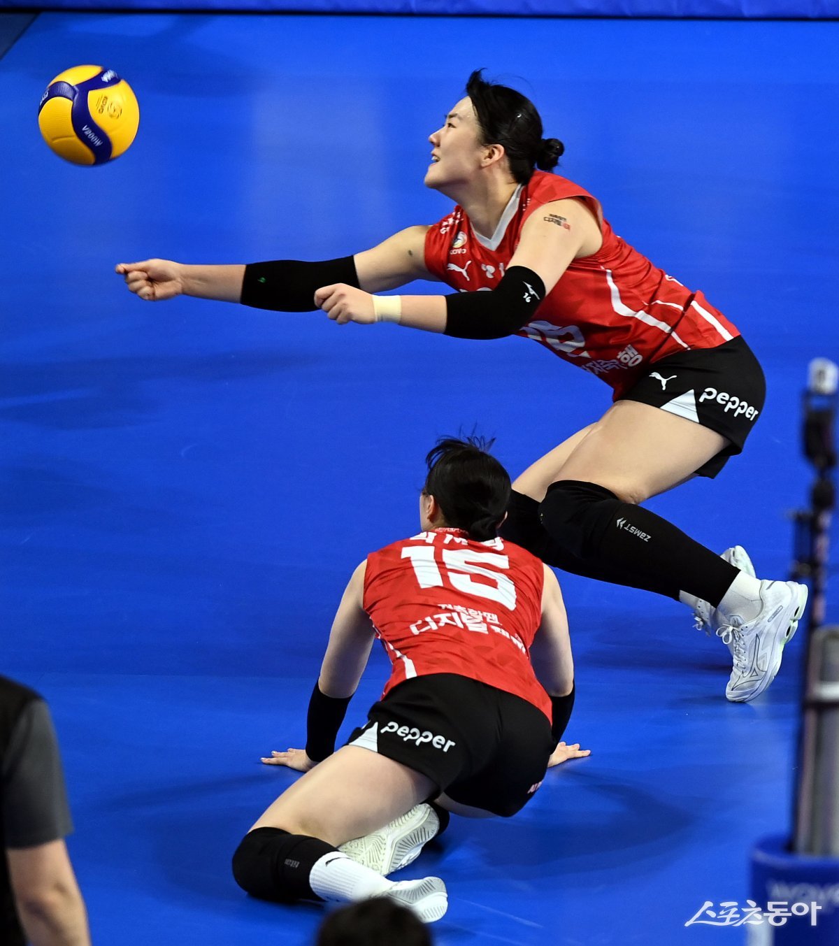 19일 경기도 화성종합실내체육관에서 ‘2023-2024 도드람 V리그’ 화성 IBK기업은행과 광주 페퍼저축은행의 여자부 경기가 열렸다. 페퍼저축은행 이한비가 수비를 펼치고 있다.