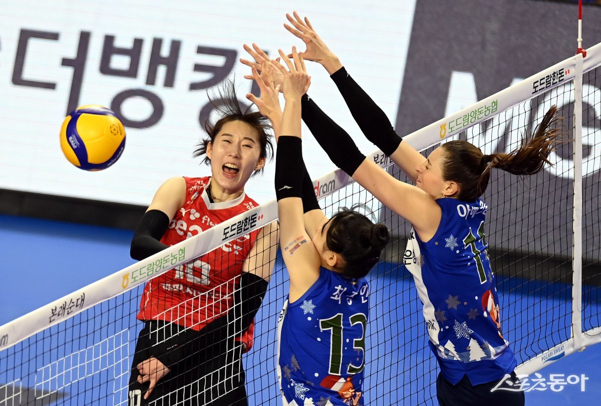 19일 경기도 화성종합실내체육관에서 ‘2023-2024 도드람 V리그’ 화성 IBK기업은행과 광주 페퍼저축은행의 여자부 경기가 열렸다. 페퍼저축은행 박정아가 IBK기업은행 블로커를 피해 스파이크를 날리고 있다.