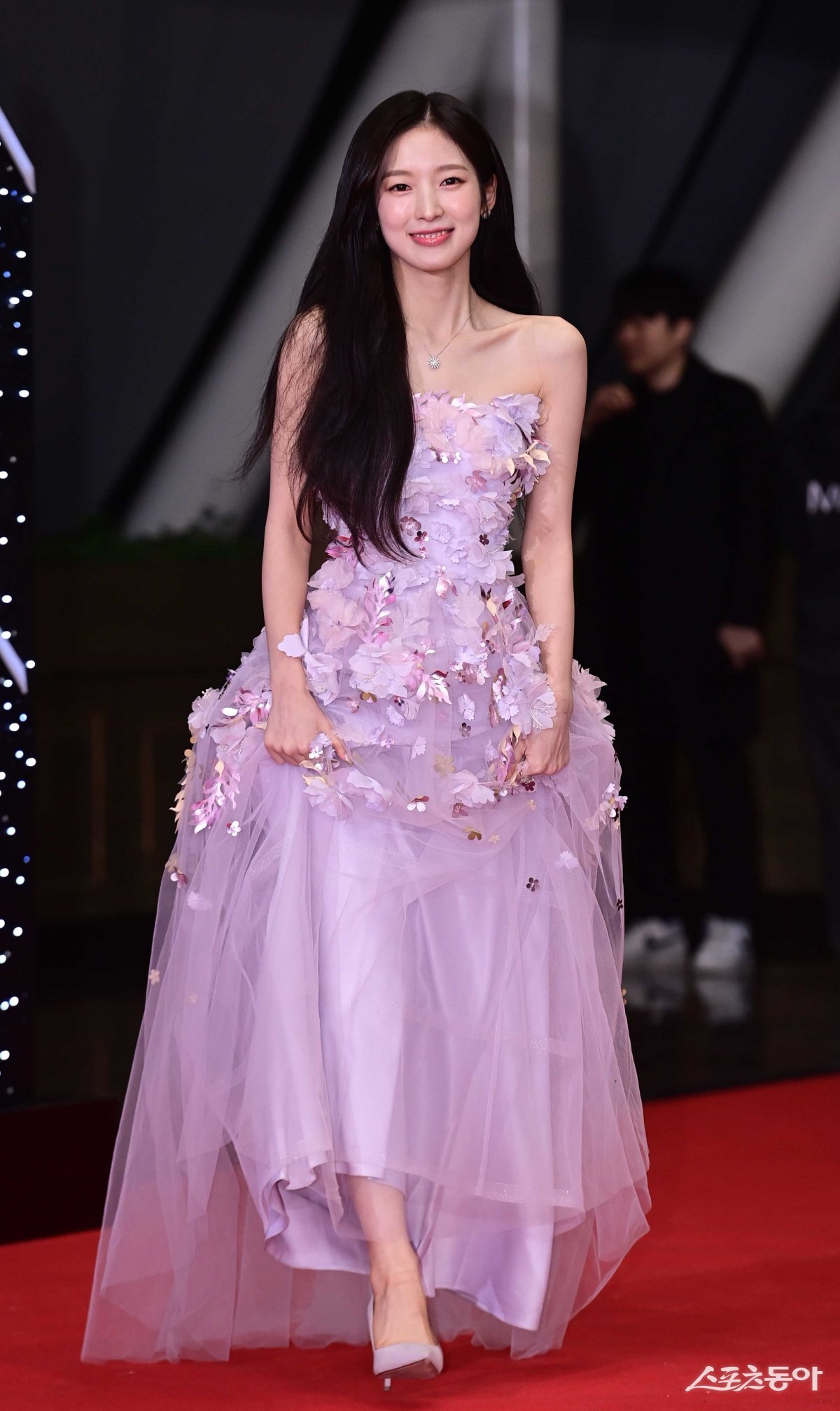 오마이걸 아린이 23일 서울 영등포구 여의도동 KBS신관 공개홀에서 열린 ‘2023 KBS 연예대상’ 포토월에서 무대에 오르고 있다.