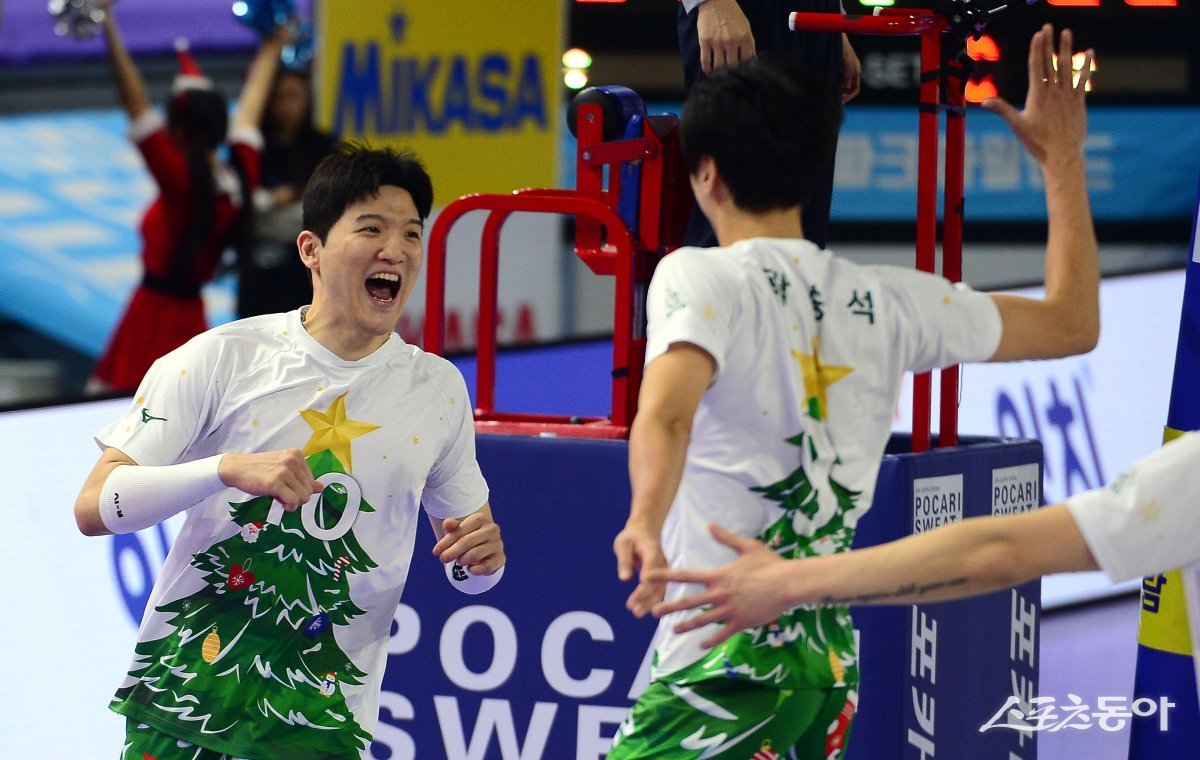 25일 인천 계양체육관에서 ‘2023-2024 도드람 V리그’ 인천 대한항공과 안산 OK금융그룹의 남자부 경기가 열렸다. 대한항공 정지석이 승리를 결정짓는 득점을 올린 후 환호하고 있다.