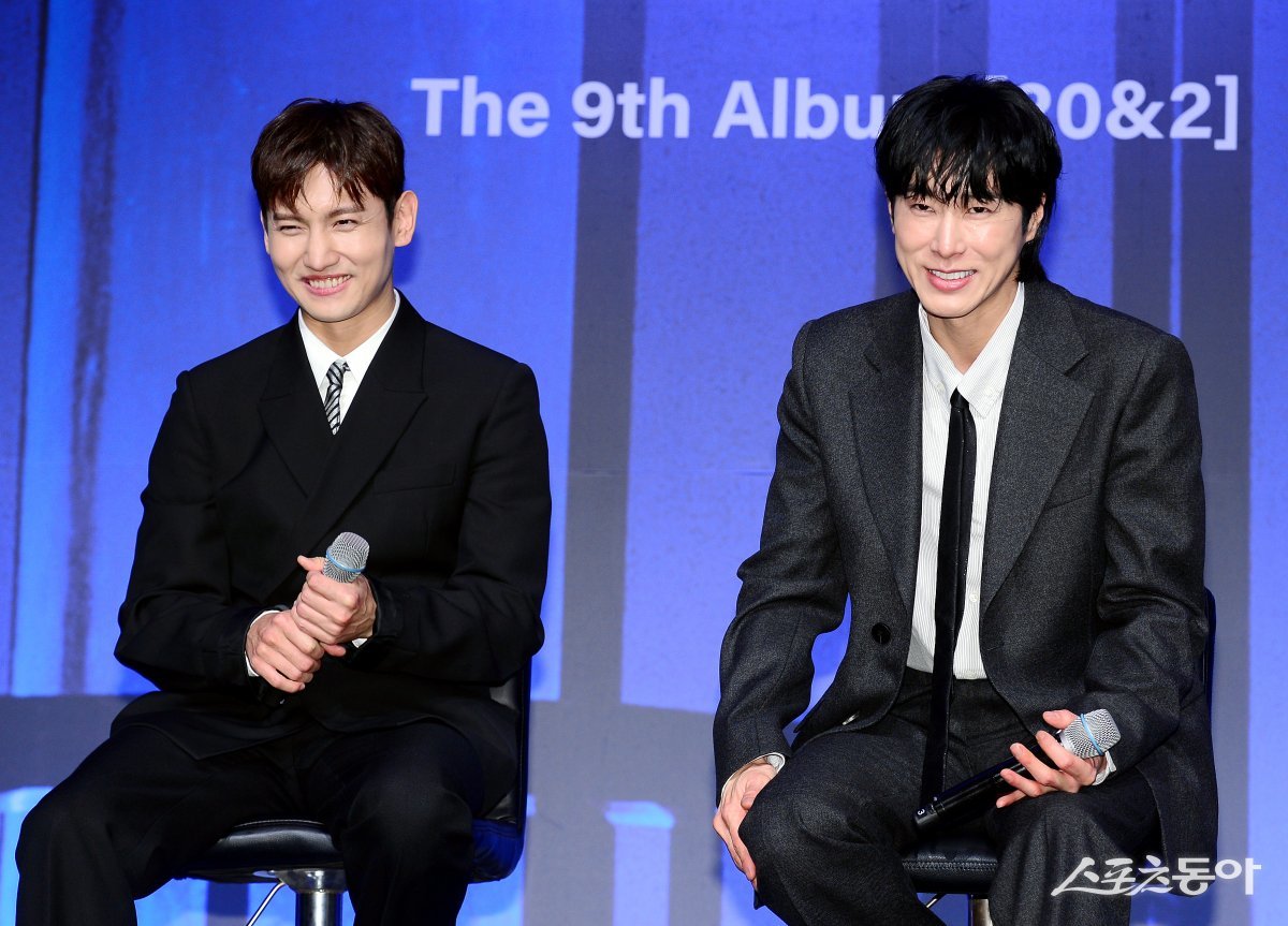 26일 서울 영등포구 여의도동 콘래드 서울 호텔에서 그룹 동방신기 아홉 번째 정규 앨범 ‘20&2’ 발매 기념 기자간담회가 열렸다. 동방신기 최강창민과 유노윤호가 앨범을 소개하고 있다.