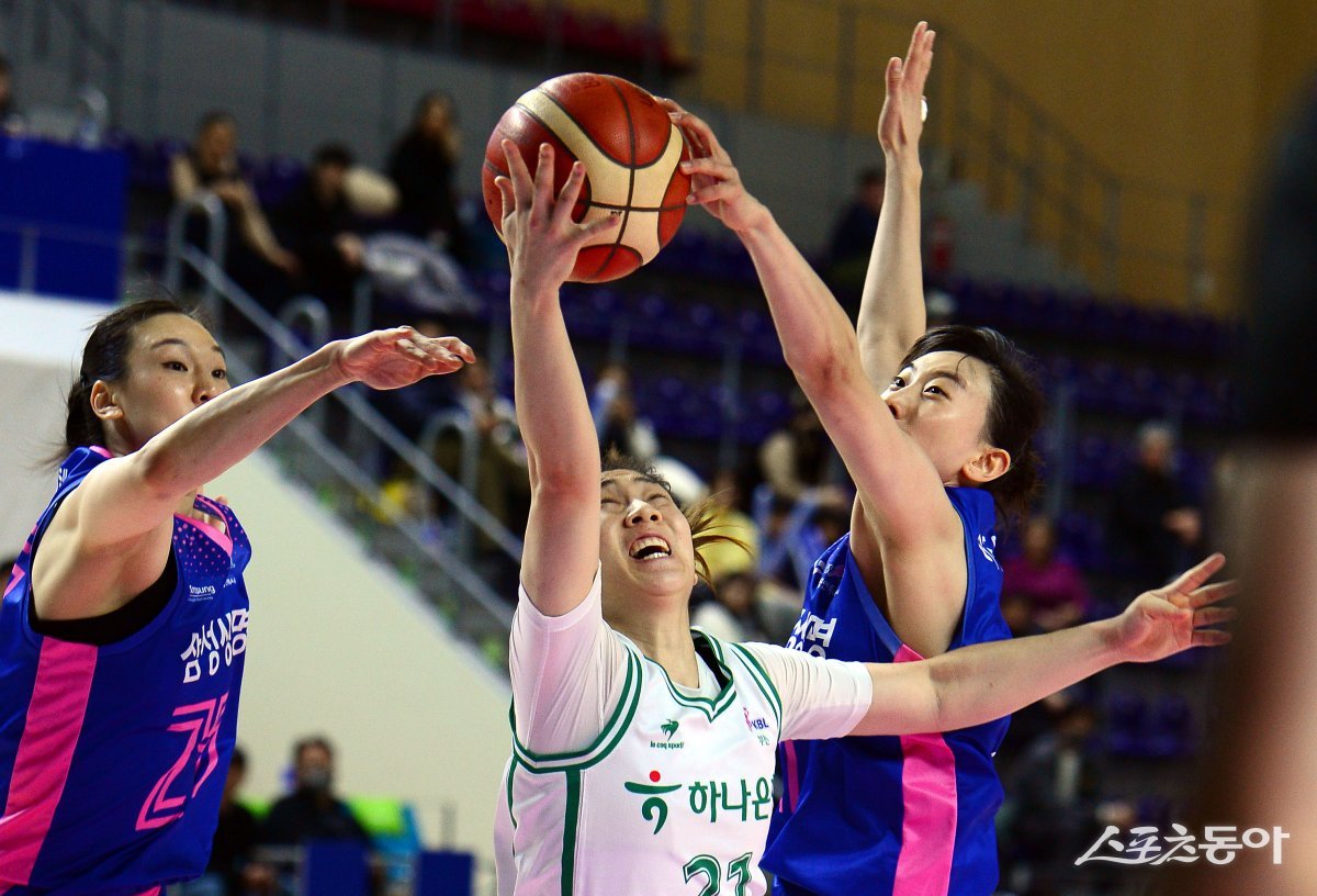 27일 경기도 용인실내체육관에서 열린 ‘우리은행 우리 WON 2023-2024 여자프로농구’ 용인 삼성생명과 부천 하나원큐의 경기에서 하나원큐 김애나가 삼성생명 이주연의 수비를 피해 슛을 쏘고 있다.