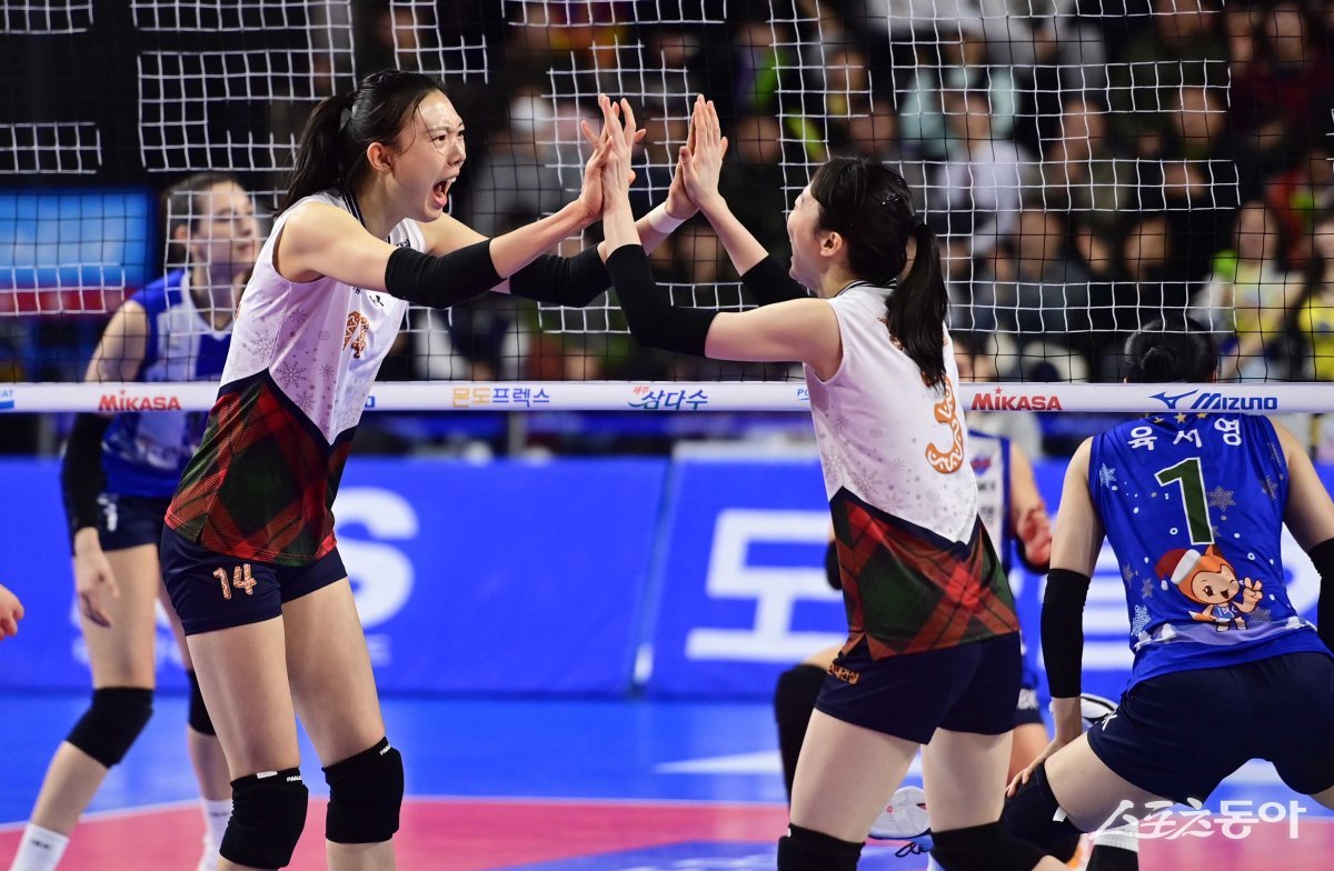 27일 경기도 화성종합경기타운 실내체육관에서 열린 ‘도드람 2023-2024 V리그’ 여자부 화성 IBK기업은행과 수원 현대건설의 경기에서 득점에 성공한 현대건설 양효진이 동료와 기쁨을 나누고 있다.