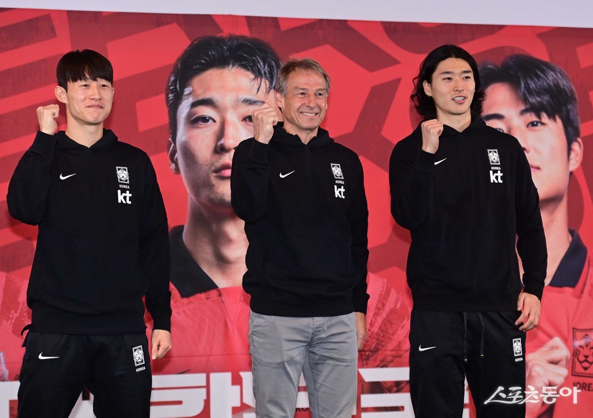 28일 서울 용산구 CGV용산아이파크몰점에서 열린 한국 축구국가대표팀의 ‘2023 AFC 카타르 아시안컵’ 명단발표식에서 이재성, 클린스만 감독, 조규성이 포즈를 취하고 있다.
