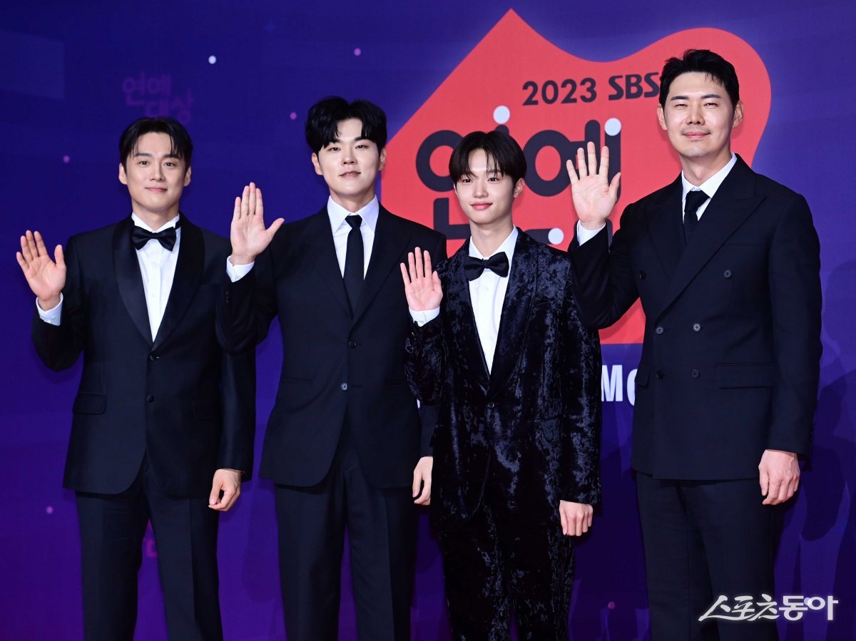 방송인 오상진, 이인권, 손동표, 유정수가 30일 서울 마포구 상암동 SBS프리즘타워에서 열린 ‘2023 SBS 연예대상’ 포토월에서 포즈를 취하고 있다.
