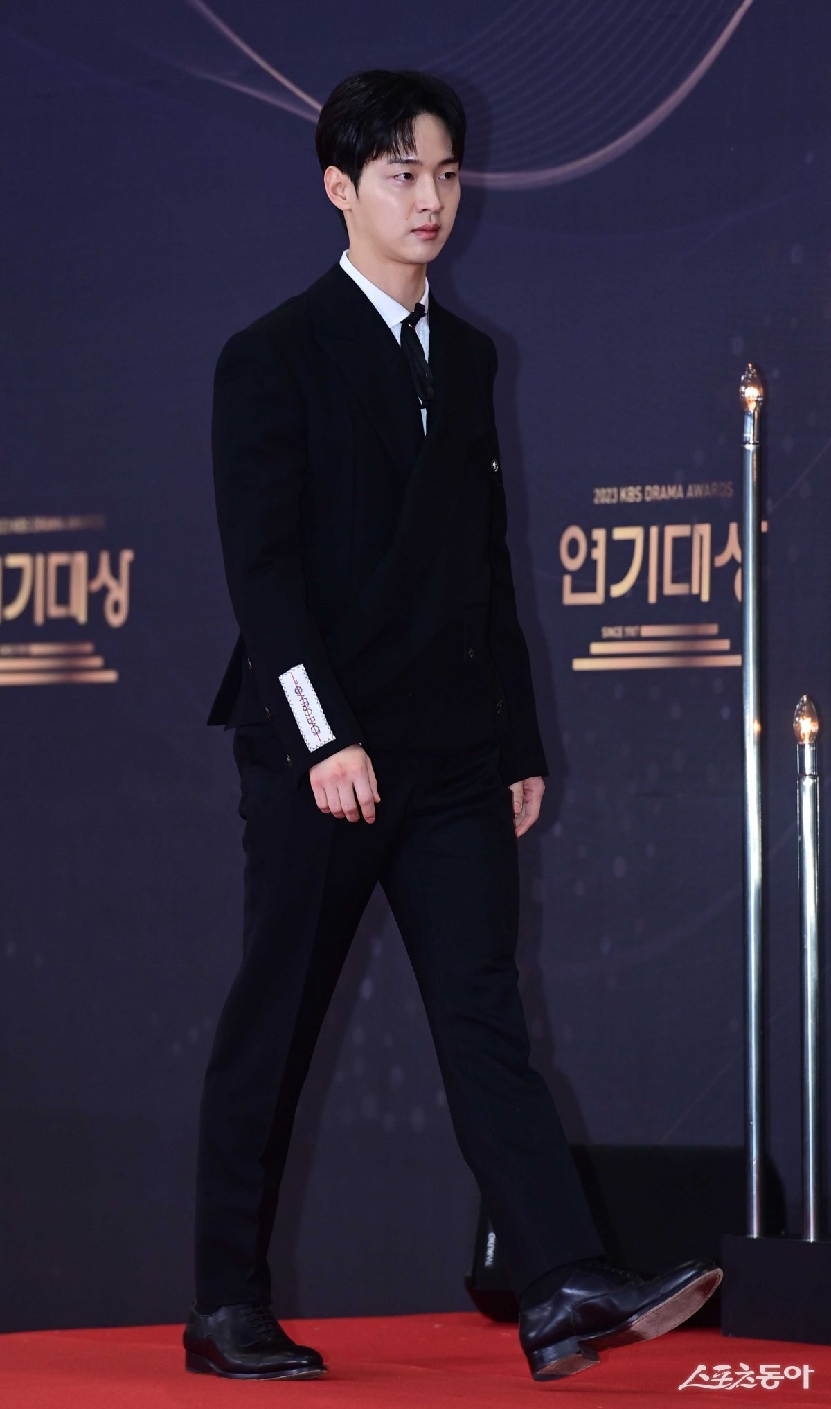 배우 장동윤이 31일 서울 영등포구 여의도 KBS신관 공개홀에서 열린 ‘2023 KBS 연기대상’ 포토월 무대에 오르고 있다.