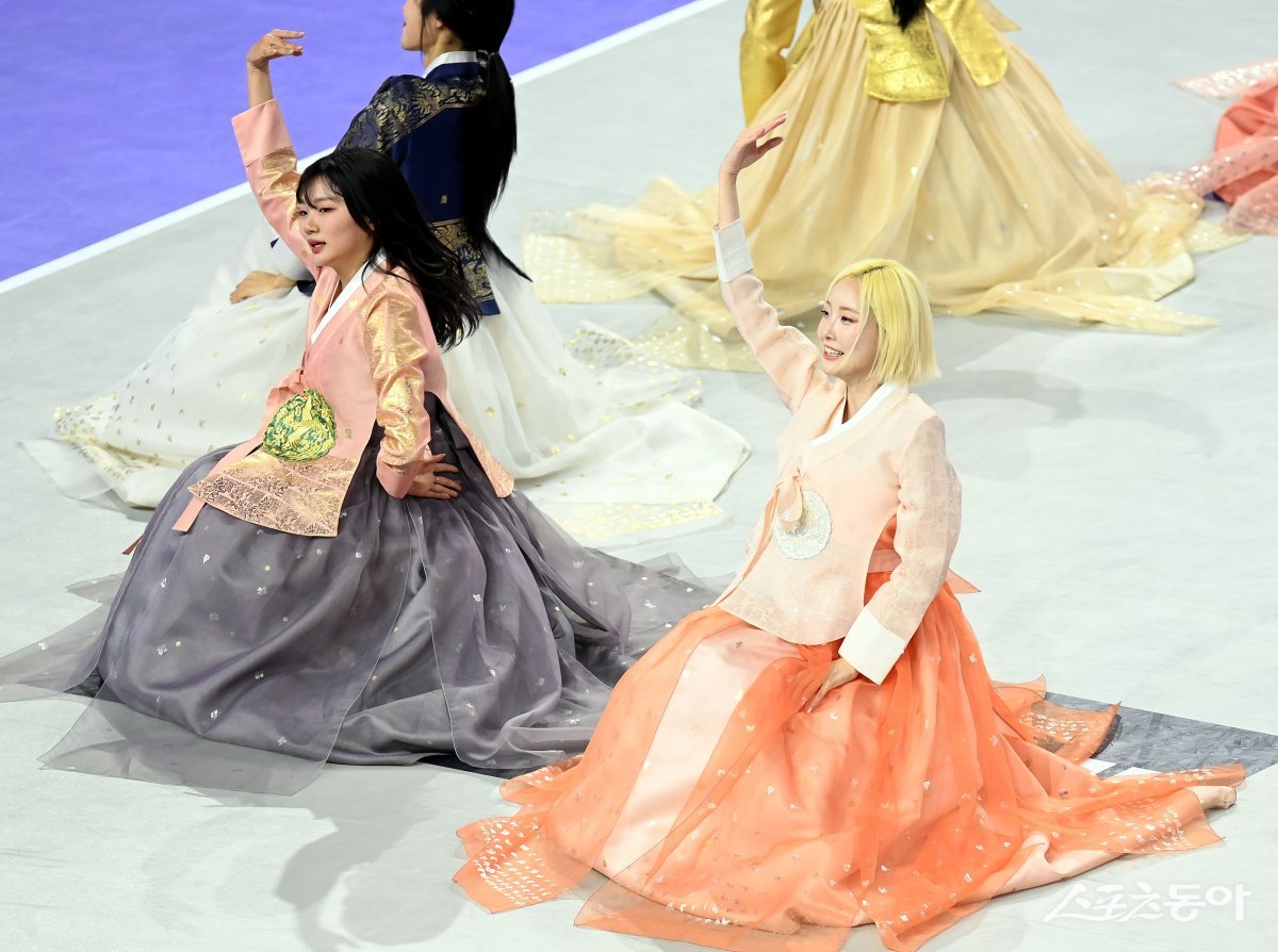 1일 인천 계양체육관에서 ‘2023-2024 도드람 V리그’ 인천 대한항공과 수원 한국전력의 남자부 경기가 열렸다. 대한항공 치어리더가 한복을 입고 공연을 펼치고 있다.