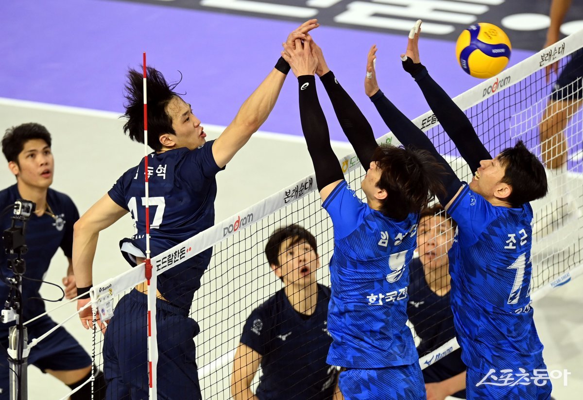 1일 인천 계양체육관에서 ‘2023-2024 도드람 V리그’ 인천 대한항공과 수원 한국전력의 남자부 경기가 열렸다. 대한항공 임동혁이 한국전력 블로커를 피해 공격을 펼치고 있다.