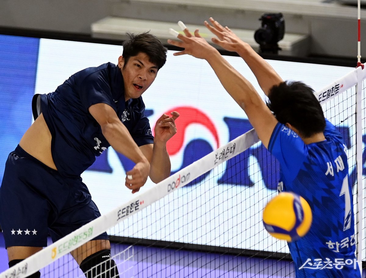 1일 인천 계양체육관에서 ‘2023-2024 도드람 V리그’ 인천 대한항공과 수원 한국전력의 남자부 경기가 열렸다. 대한항공 에스페호가 한국전력 블로커를 피해 스파이크를 날리고 있다.