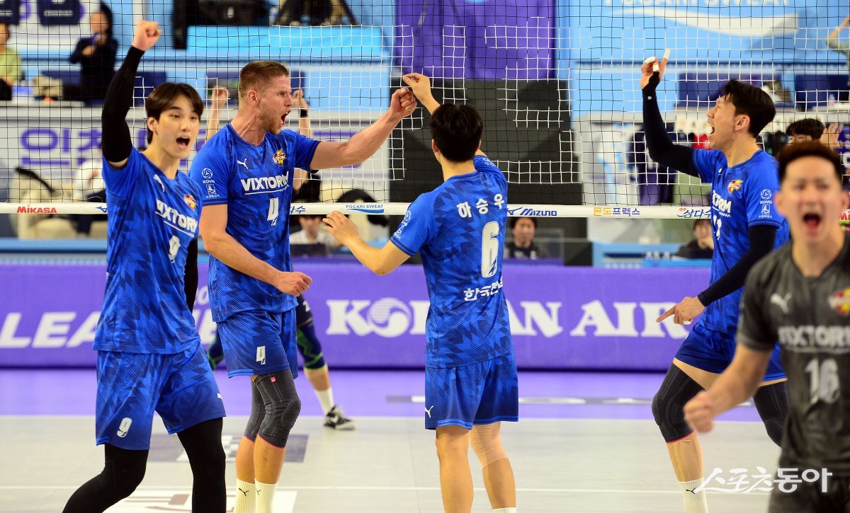 1일 인천 계양체육관에서 ‘2023-2024 도드람 V리그’ 인천 대한항공과 수원 한국전력의 남자부 경기가 열렸다. 한국전력 타이스가 득점을 올린 후 동료들과 기쁨을 나누고 있다.