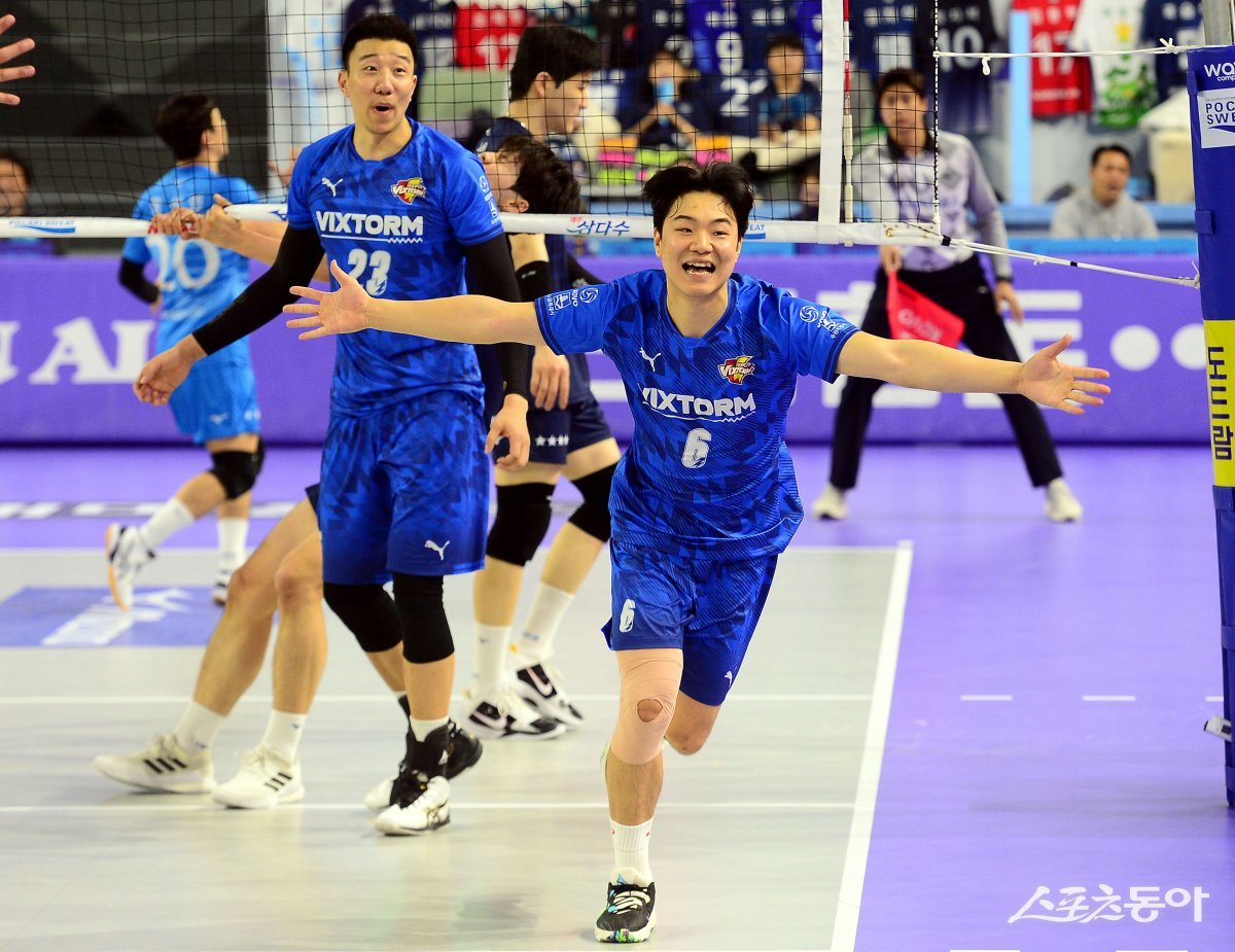 1일 인천 계양체육관에서 ‘2023-2024 도드람 V리그’ 인천 대한항공과 수원 한국전력의 남자부 경기가 열렸다. 한국전력 하승우가 가로막기 득점을 올린 후 환호하고 있다.