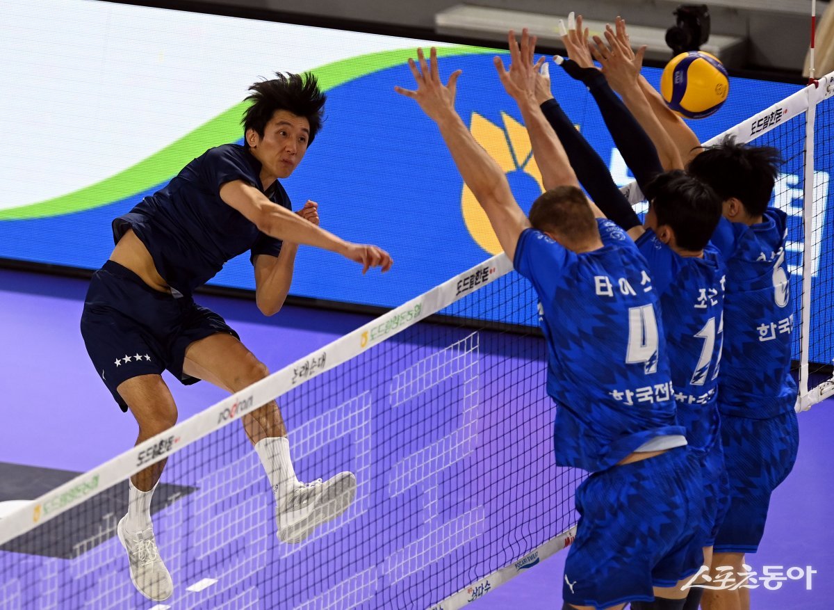 1일 인천 계양체육관에서 ‘2023-2024 도드람 V리그’ 인천 대한항공과 수원 한국전력의 남자부 경기가 열렸다. 대한항공 곽승석이 한국전력 블로커를 피해 스파이크를 날리고 있다.