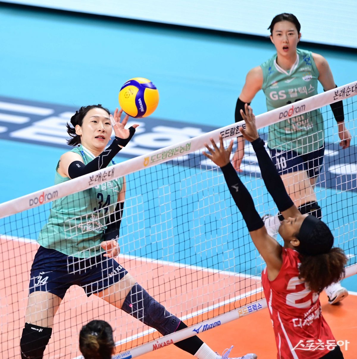 2일 서울 장충체육관에서 열린 ‘도드람 2023-2024 V리그’ 여자부 서울 GS칼텍스와 광주 페퍼저축은행의 경기에서 GS칼텍스 한수지가 밀어넣기 공격을 하고 있다.