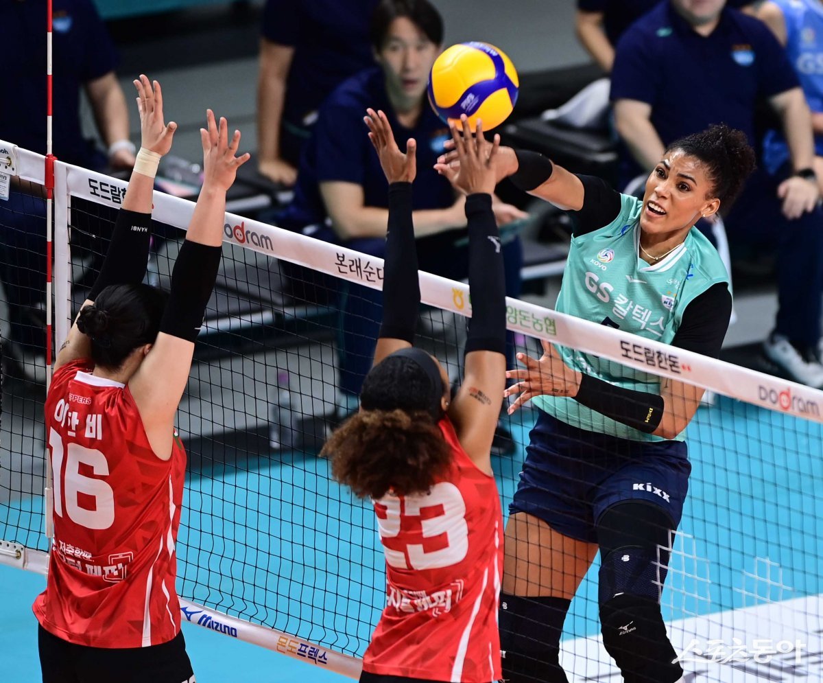 2일 서울 장충체육관에서 열린 ‘도드람 2023-2024 V리그’ 여자부 서울 GS칼텍스와 광주 페퍼저축은행의 경기에서 GS칼텍스 실바가 페퍼저축은행 블로커 앞에서 스파이크를 하고 있다.