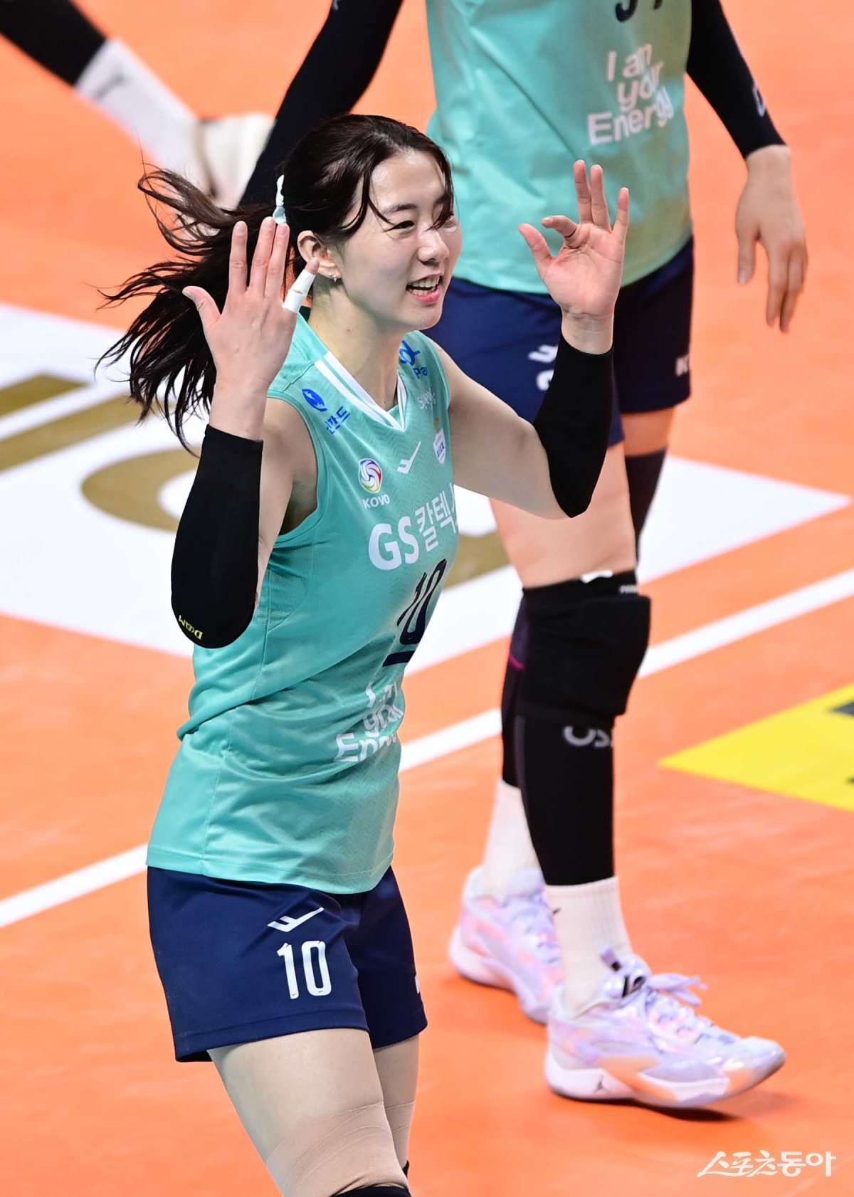 2일 서울 장충체육관에서 열린 ‘도드람 2023-2024 V리그’ 여자부 서울 GS칼텍스와 광주 페퍼저축은행의 경기에서 블로킹 득점에 성공한 GS칼텍스 강소휘가 기뻐하고 있다.
