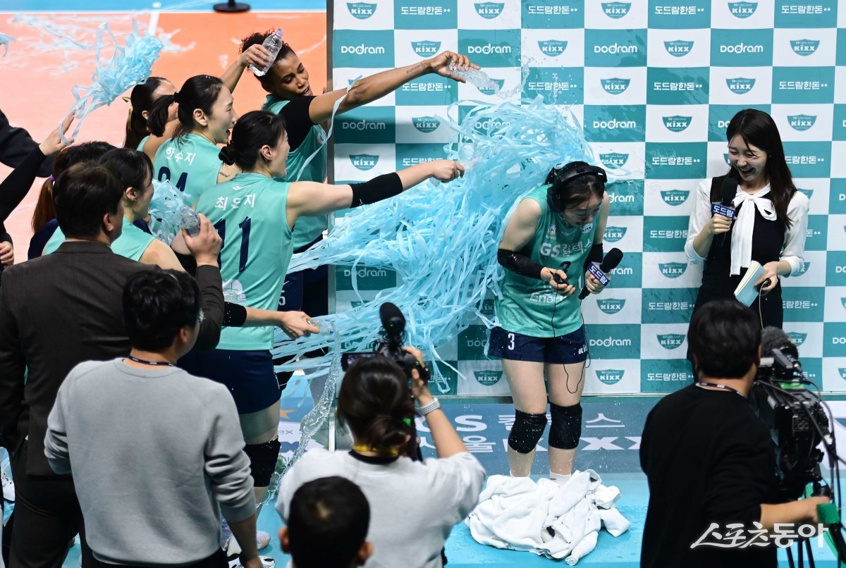 2일 서울 장충체육관에서 열린 ‘도드람 2023-2024 V리그’ 여자부 서울 GS칼텍스와 광주 페퍼저축은행의 경기에서 세트스코어 3-0으로 승리한 GS칼텍스 이윤신이 동료들로부터 물 세리머니를 받고 있다.
