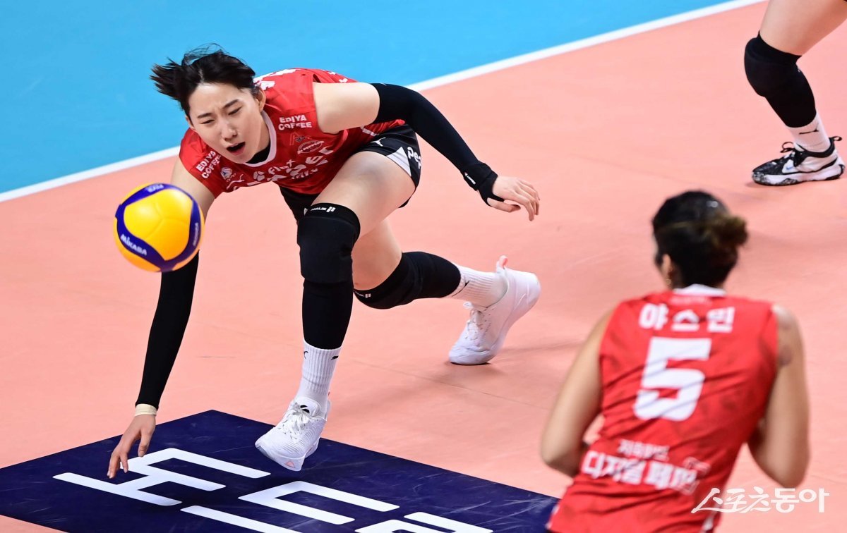2일 서울 장충체육관에서 열린 ‘도드람 2023-2024 V리그’ 여자부 서울 GS칼텍스와 광주 페퍼저축은행의 경기에서 페퍼저축은행 박정아가 리시브를 위해 몸을 날리고 있다.