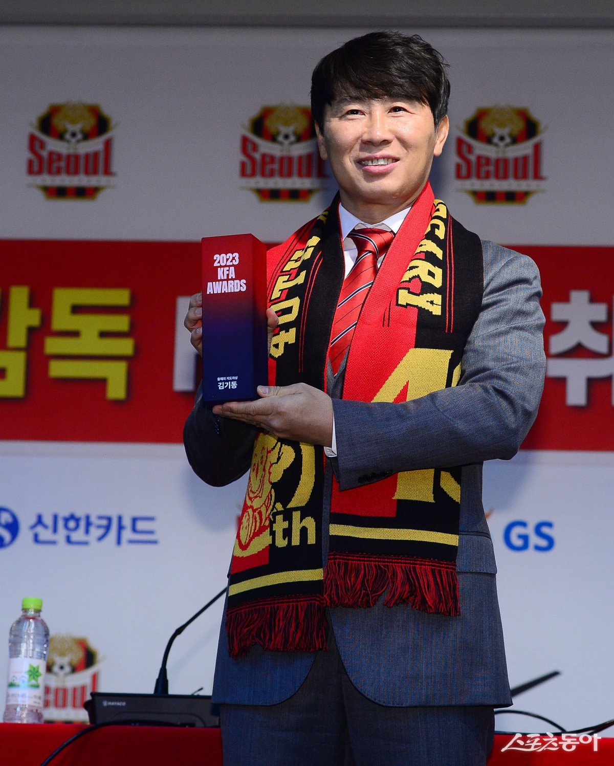 김기동 감독이 3일 서울 마포구 월드컵경기장에서 열린 FC서울 취임 기자회견에 참석해 KFA 감독상 트로피를 들고 기념촬영을 하고 있다. 상암 | 김민성 스포츠동아 기자 marineboy@donga.com