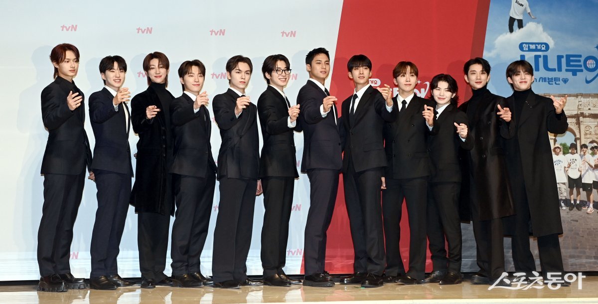 그룹 세븐틴(Seventeen)의 준, 호시, 디에잇, 디노, 버논, 원우, 민규, 도겸, 승관, 우지, 죠슈아, 에스쿱스가 3일 서울 강남구 엘리에나호텔에서 열린 tvN 새 예능 ‘나나투어 with 세븐틴’ 제작발표회‘에서 포토타임을 갖고 있다.