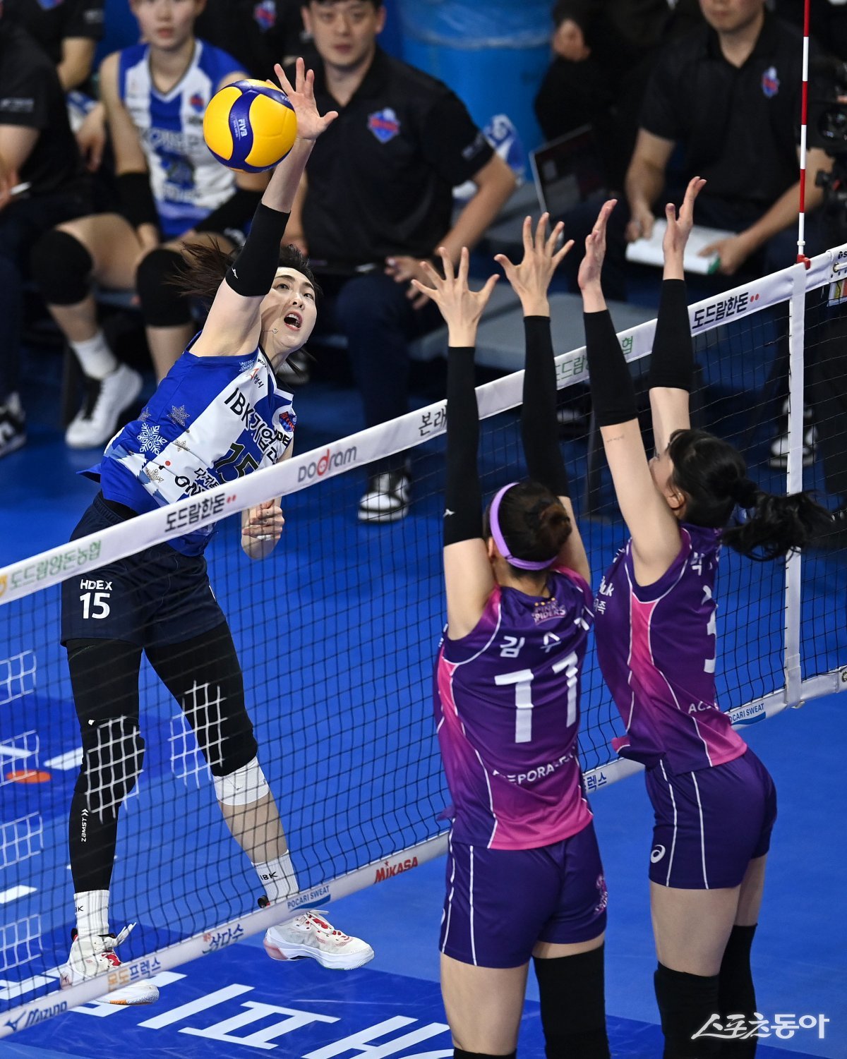 4일 화성종합경기타운 실내체육관에서 열린 ‘도드람 2023~2024 V리그’ 여자부 IBK기업은행과 흥국생명 경기에서 IBK기업은행 황민경이 흥국생명의 블로킹 사이로 스파이크 공격을 하고 있다.