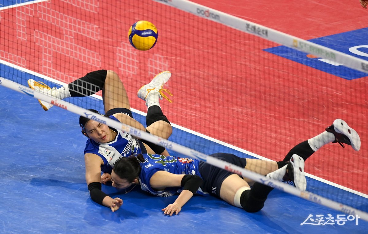 4일 화성종합경기타운 실내체육관에서 열린 ‘도드람 2023~2024 V리그’ 여자부 IBK기업은행과 흥국생명 경기에서 IBK기업은행 폰푼과 표승주가 디그를 하다 충돌하고 있다.