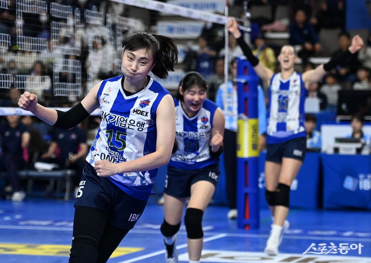 4일 화성종합경기타운 실내체육관에서 열린 ‘도드람 2023~2024 V리그’ 여자부 IBK기업은행과 흥국생명 경기에서 IBK기업은행 황민경이 공격 득점에 성공한 후 기뻐하고 있다.