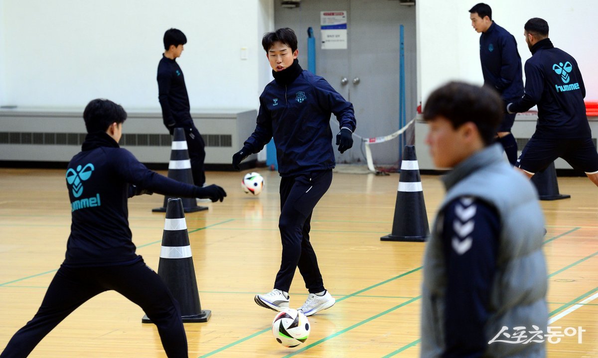 프로축구 수원FC가 9일 경기도 수원 경기도인재개발원 실내체육관에서 2024시즌을 향한 소집훈련을 가졌다. 수원FC 윤빛가람이 패스 훈련을 펼치고 있다.