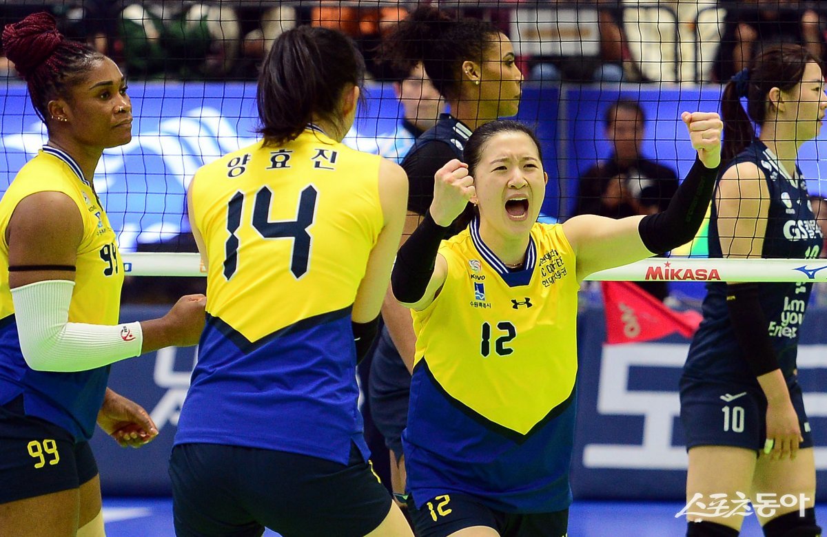 10일 경기도 수원체육관에서 ‘2023-2024 도드람 V리그’ 수원 현대건설과 서울 GS칼텍스의 여자부 경기가 열렸다. 현대건설이 GS칼텍스를 상대로 세트스코어 3-2 승리 후 이다현이 환호하고 있다. 수원 | 김민성 기자 marineboy@donga.com