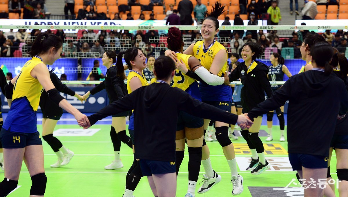 10일 경기도 수원체육관에서 ‘2023-2024 도드람 V리그’ 수원 현대건설과 서울 GS칼텍스의 여자부 경기가 열렸다. 현대건설이 GS칼텍스를 상대로 세트스코어 3-2 승리 후 이다현이 동료들과 기쁨을 나누고 있다. 수원 | 김민성 기자 marineboy@donga.com