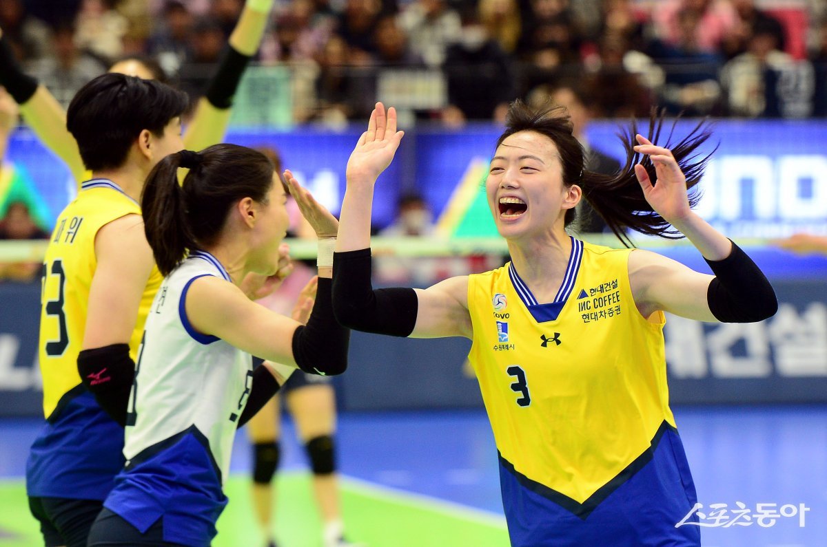 10일 경기도 수원체육관에서 ‘2023-2024 도드람 V리그’ 수원 현대건설과 서울 GS칼텍스의 여자부 경기가 열렸다. 현대건설 김다인이 승리를 앞두고 환호하고 있다. 수원 | 김민성 기자 marineboy@donga.com