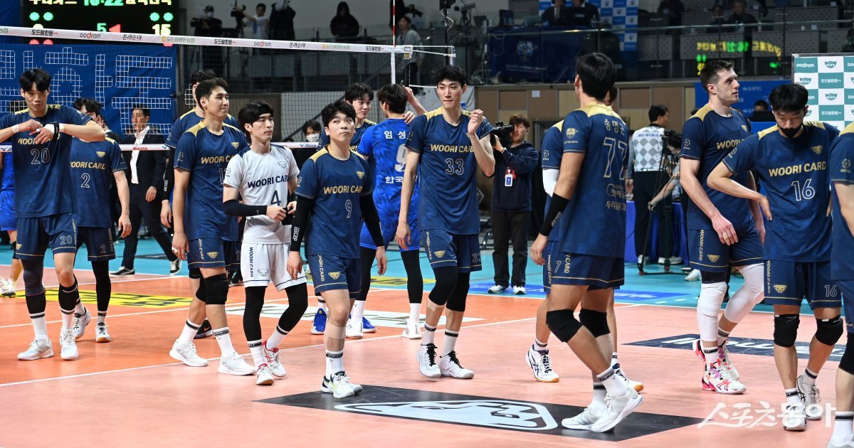 14일 장충체육관에서 열린 ‘도드람 2023~2024 V-리그’ 남자부 우리카드와 한국전력 경기에서 세트스코어 2-3으로 패하며 4연패에 빠진 우리카드 선수들이 아쉬워하고 있다.