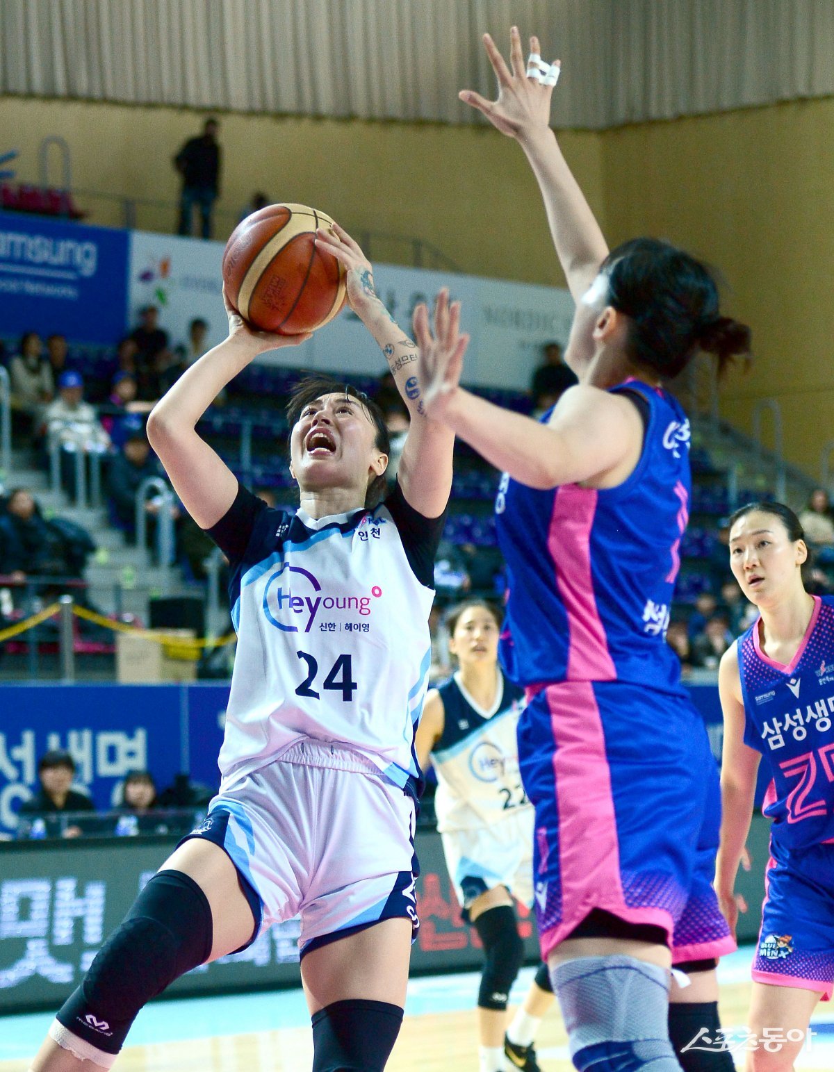 15일 용인실내체육관에서 열린 ‘우리은행 우리WON 2023~24 여자프로농구’ 삼성생명과 신한은행 경기에서 신한은행 김소니아가 삼성생명의 수비를 뚫고 골밑 슛을 하고 있다.