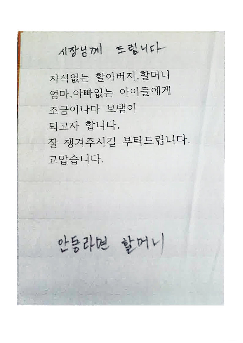 자신을 ‘안동 라면할머니’라고 밝힌 편지에는 “시장님께 드립니다. 자식 없는 할아버지 할머니, 엄마 아빠 없는 아이들에게 조금이나마 보탬이 되고자 합니다. 잘 챙겨주시길 부탁드립니다. 고맙습니다. 안동 라면할머니”라고 적혀 있어 추운 겨울 따뜻한 감동과 보는 이들의 눈시울을 붉히게 한다.