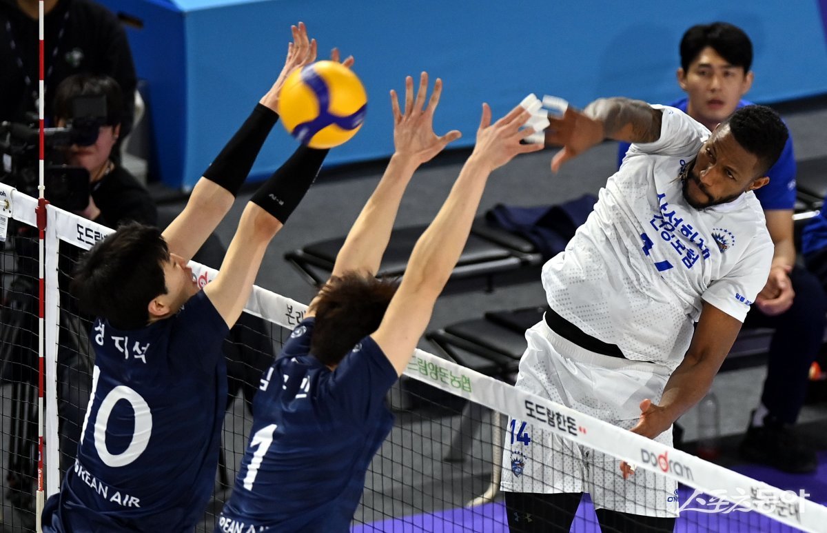 16일 인천 계양체육관에서 ‘2023-2024 도드람 V리그’ 인천 대한항공과 대전 삼성화재의 남자부 경기가 열렸다. 삼성화재 요스바니가 대한항공 블로커를 피해 스파이크를 날리고 있다.