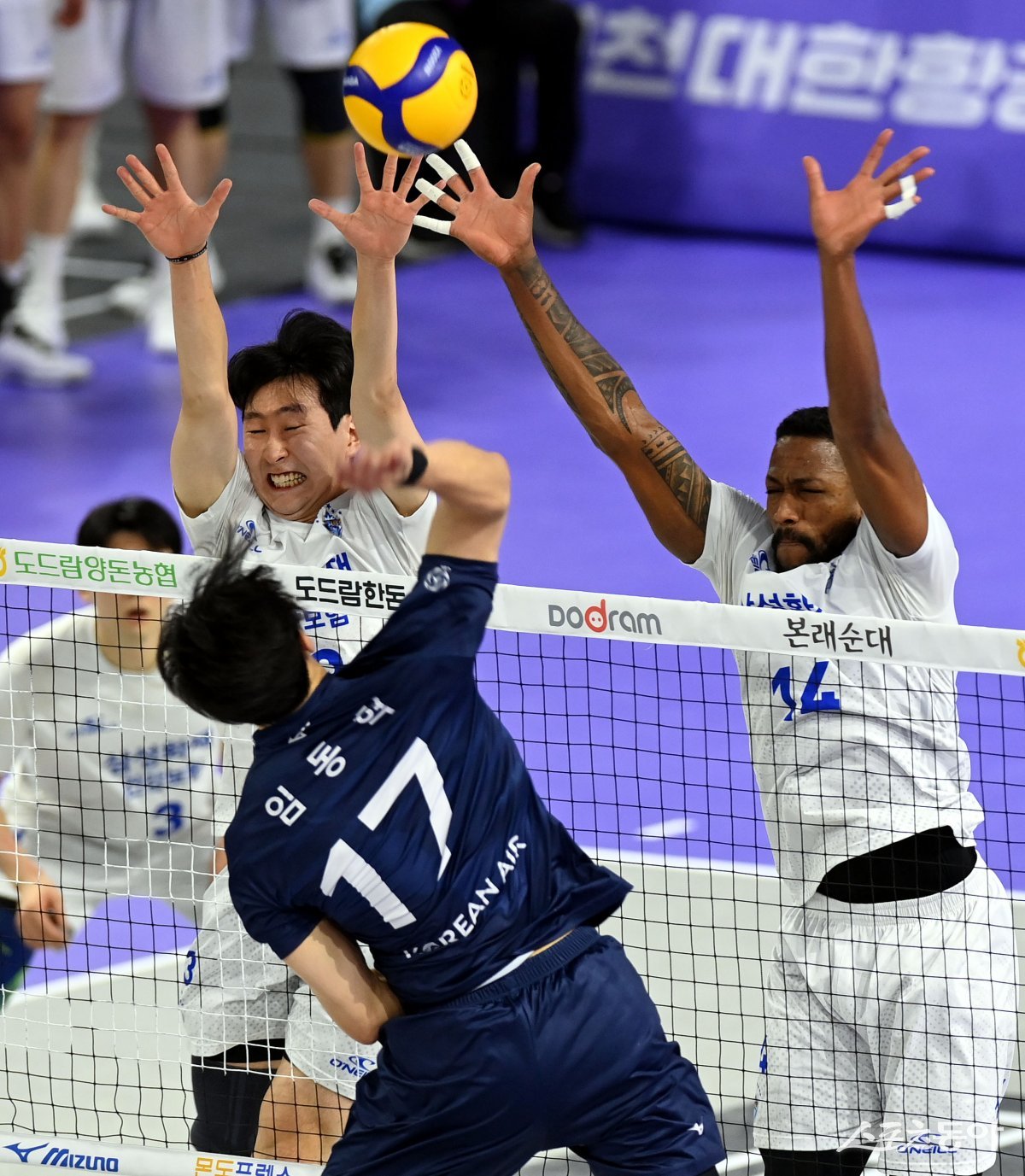 16일 인천 계양체육관에서 ‘2023-2024 도드람 V리그’ 인천 대한항공과 대전 삼성화재의 남자부 경기가 열렸다. 삼성화재 김준우와 요스바니가 블로킹을 시도하고 있다.