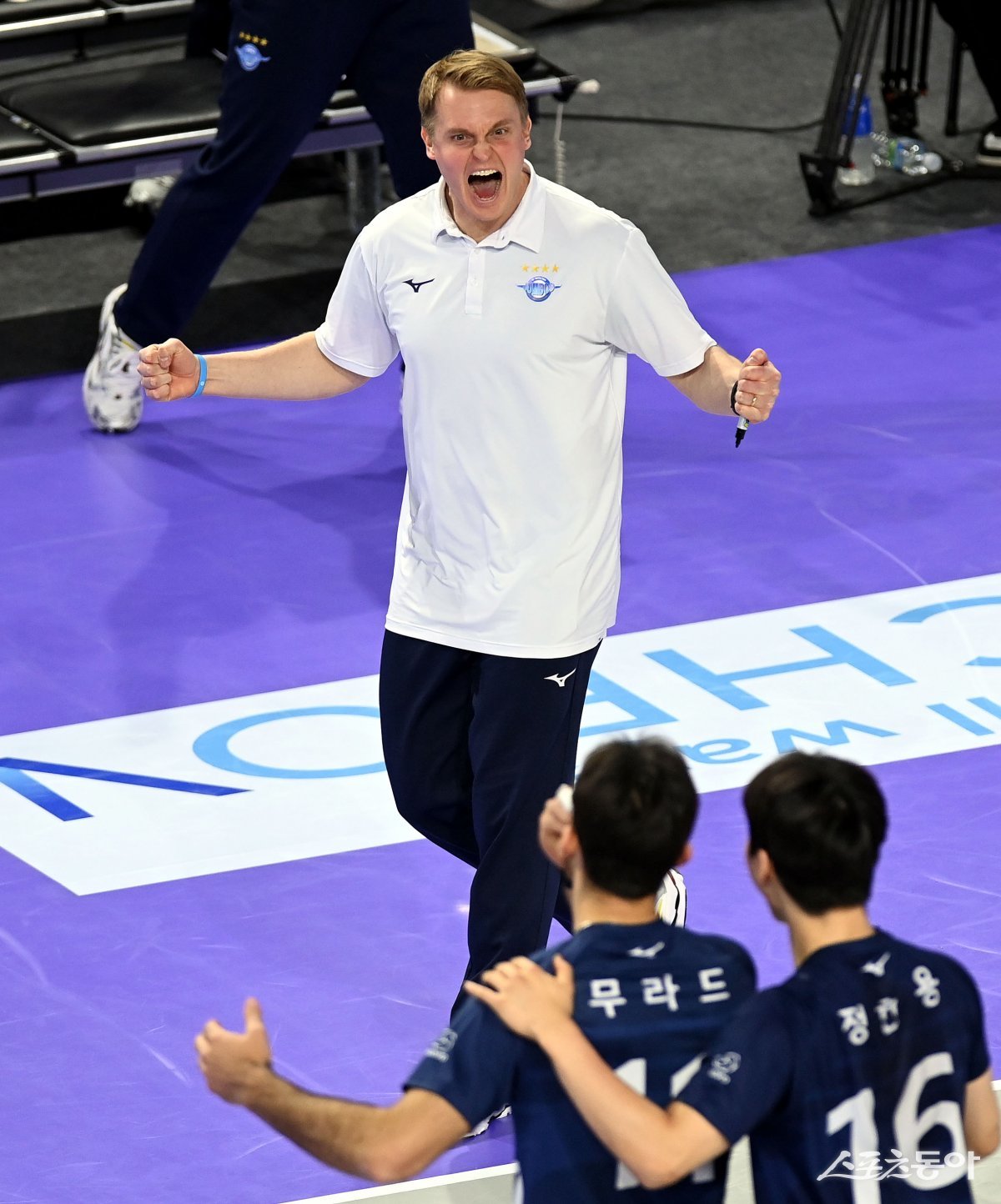 16일 인천 계양체육관에서 ‘2023-2024 도드람 V리그’ 인천 대한항공과 대전 삼성화재의 남자부 경기가 열렸다. 대한항공 틸리카이넨 감독이 무라드의 득점에 환호하고 있다.