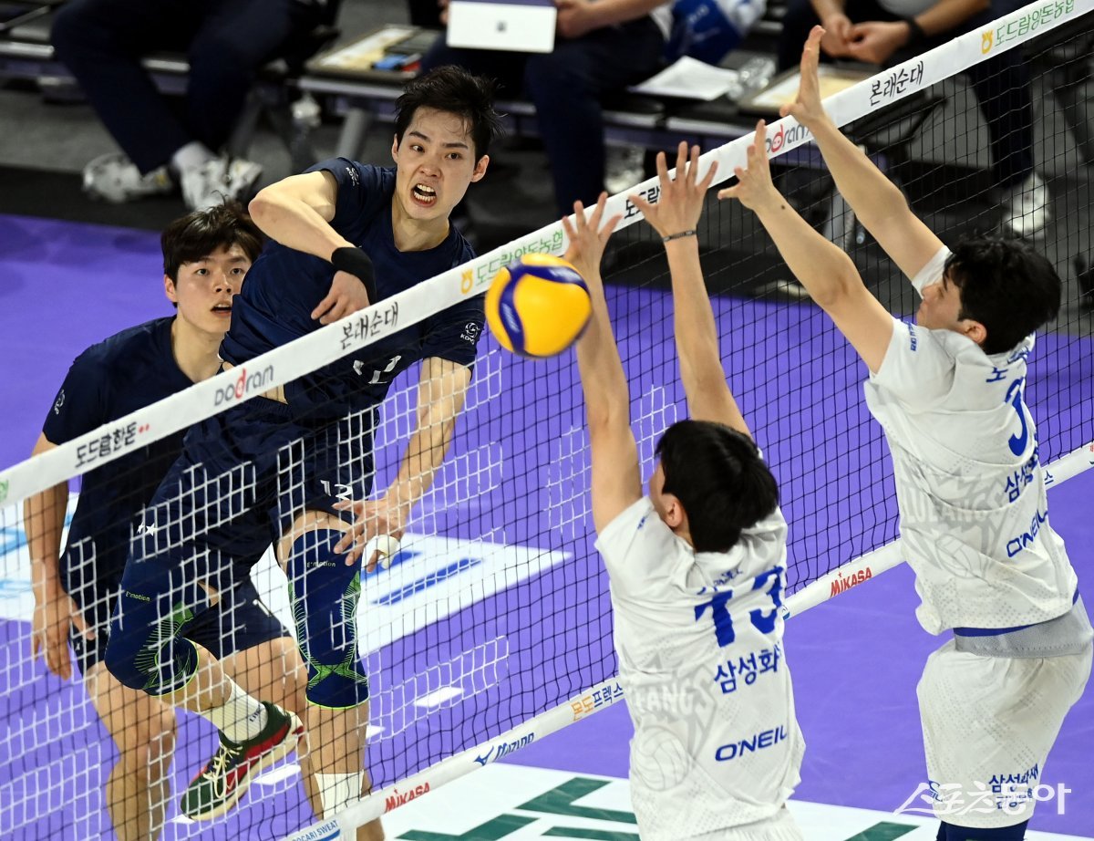 16일 인천 계양체육관에서 ‘2023-2024 도드람 V리그’ 인천 대한항공과 대전 삼성화재의 남자부 경기가 열렸다. 대한항공 조재영이 삼성화재 블로커를 피해 공격을 펼치고 있다.
