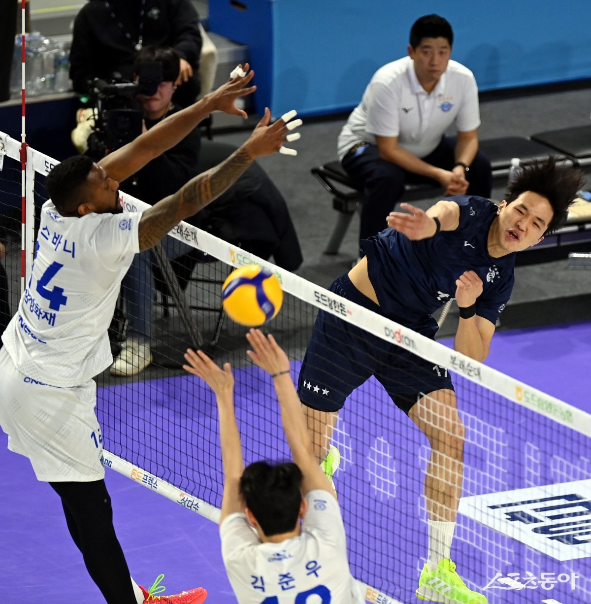 16일 인천 계양체육관에서 ‘2023-2024 도드람 V리그’ 인천 대한항공과 대전 삼성화재의 남자부 경기가 열렸다. 대한항공 임동혁이 삼성화재 블로커를 피해 스파이크를 날리고 있다.