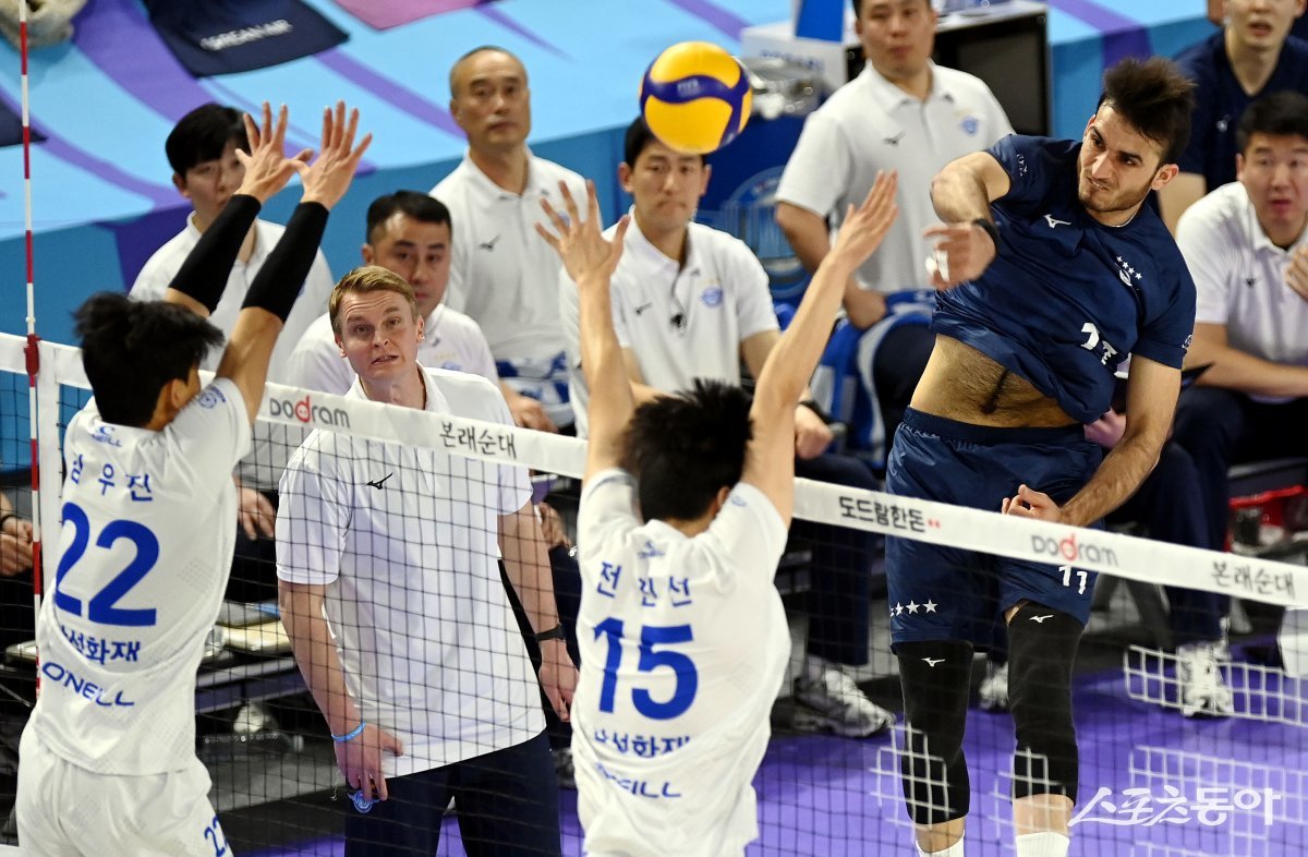16일 인천 계양체육관에서 ‘2023-2024 도드람 V리그’ 인천 대한항공과 대전 삼성화재의 남자부 경기가 열렸다. 대한항공 무라드가 삼성화재 블로커를 피해 스파이크를 날리고 있다.