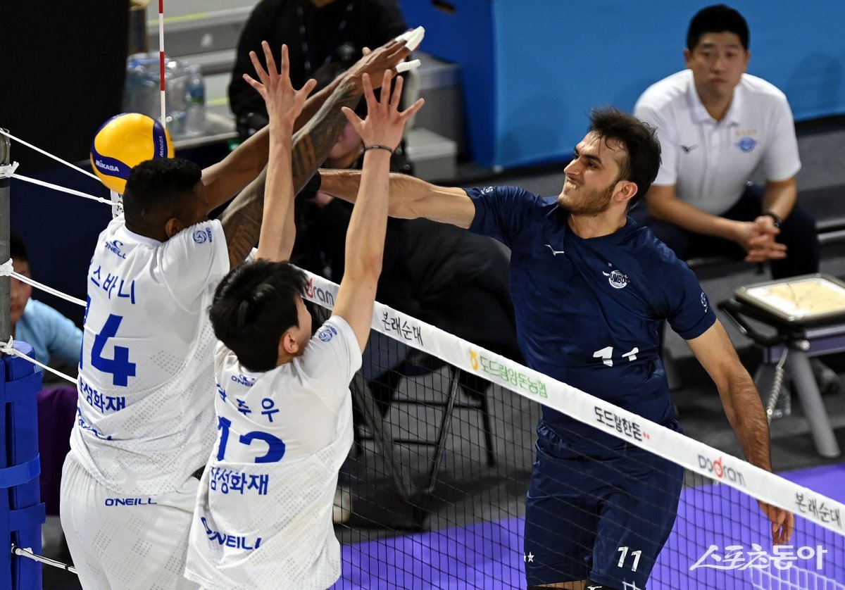 16일 인천 계양체육관에서 ‘2023-2024 도드람 V리그’ 인천 대한항공과 대전 삼성화재의 남자부 경기가 열렸다. 대한항공 무라드가 삼성화재 블로커를 피해 공격을 펼치고 있다.