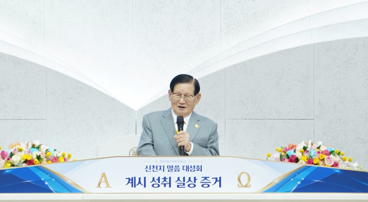 17일 울산 남구 안드레지파 울산교회에서 ‘계시 성취 실상 증거’를 주제로 신천지 말씀대성회가 열린 가운데 신천지예수교회 이만희 총회장이 강연하고 있다. 올해 첫 강연으로 열린 이날 말씀대성회는 부산 경남 지역의 목회자와 일반성도 등을 대상으로 열렸다.
