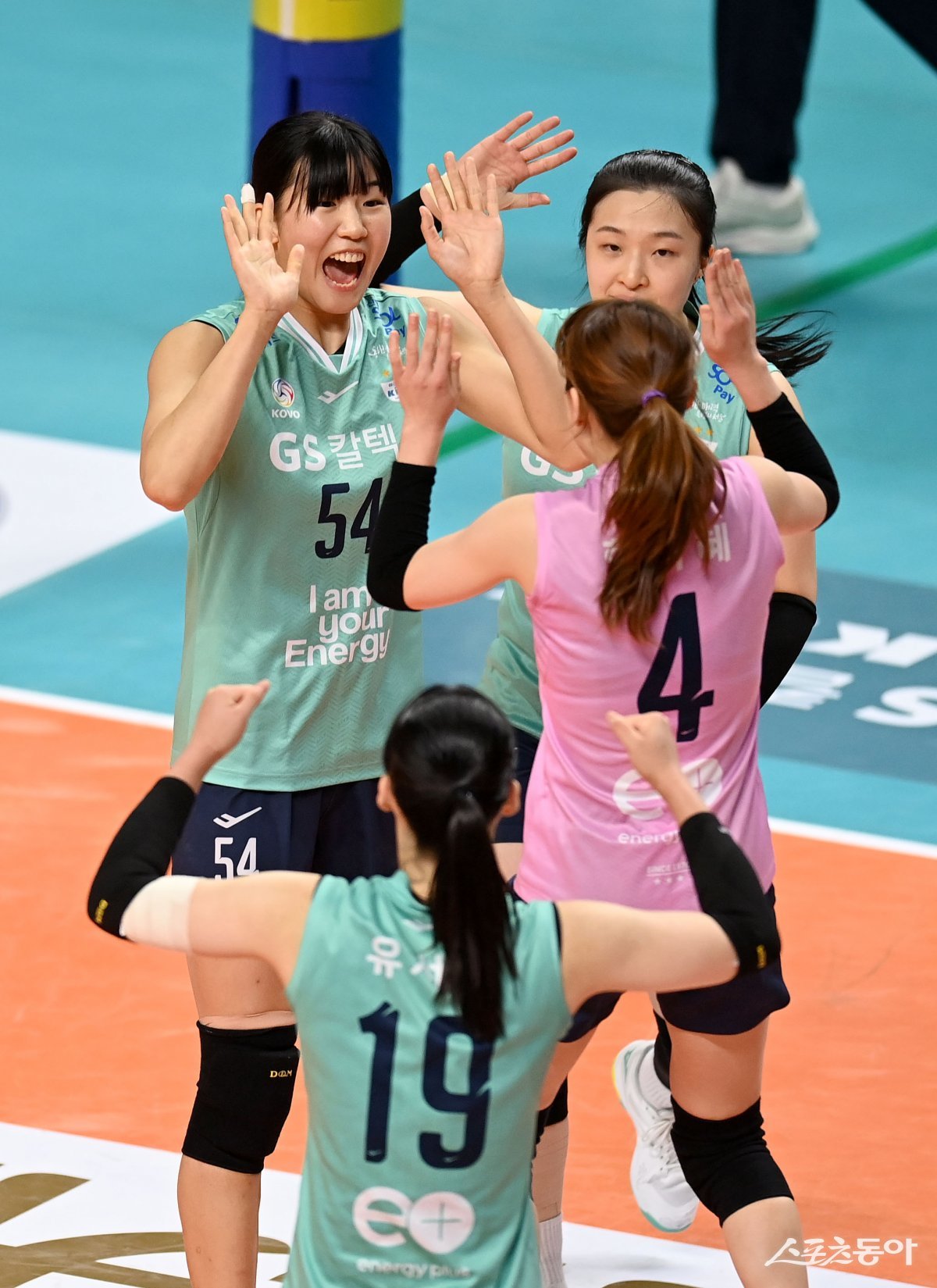17일 서울 장충체육관에서 열린 ‘도드람 2023~2024 V-리그’ 여자부 GS칼텍스와 흥국생명 경기에서 GS칼텍스 오세연이 블로킹 득점에 성공한 후 기뻐하고 있다.