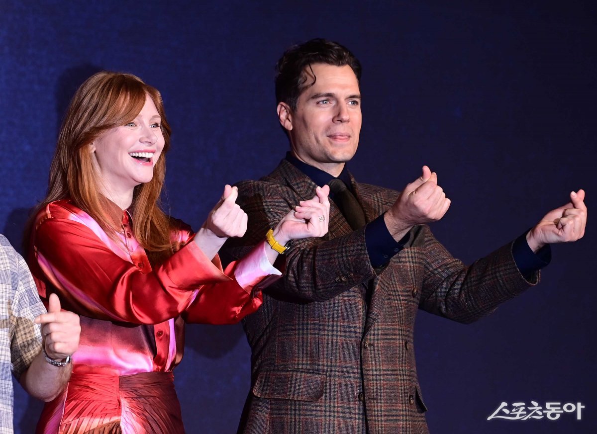 배우 브라이스 달라스 하워드, 헨리 카빌이 18일 서울 종로구 당주동 포시즌스호텔 서울에서 열린 영화 ‘아가일’ 내한 기자간담회에서 포즈를 취하고 있다.